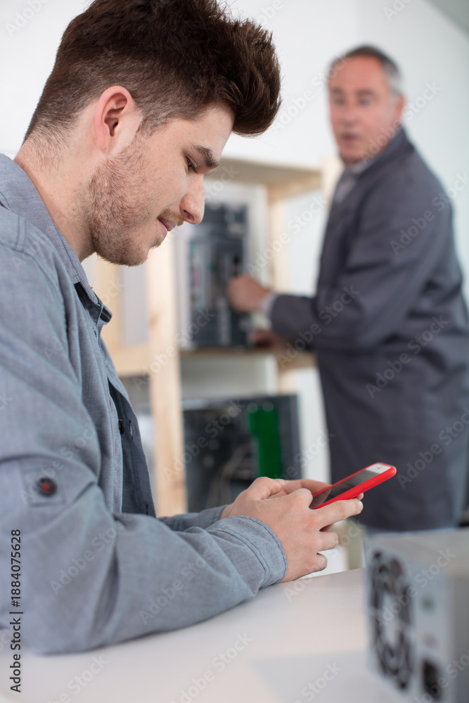 older colleague sees young man using smartphone while at work