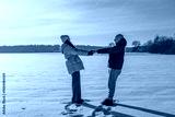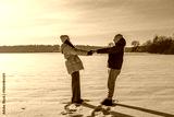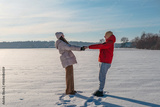 Two people stand on a snowy surface by a frozen lake, holding hands and smiling at each other during a sunny winter day with clear blue sky