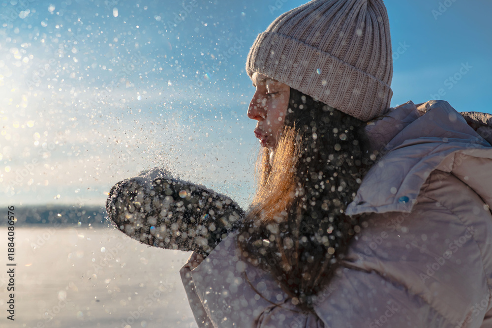 Young person blows snow from hands while enjoying winter outdoors near a frozen lake under blue sky on a sunny day