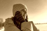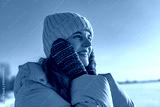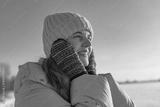 A woman stands in a snowy area, smiling while feeling the cool air on her face. She wears warm clothing and a hat, with a bright sky overhead