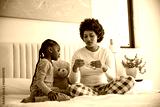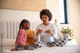 African american mother and daughter sitting on bed opening package with teddy bear in bedroom