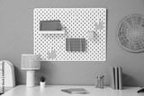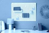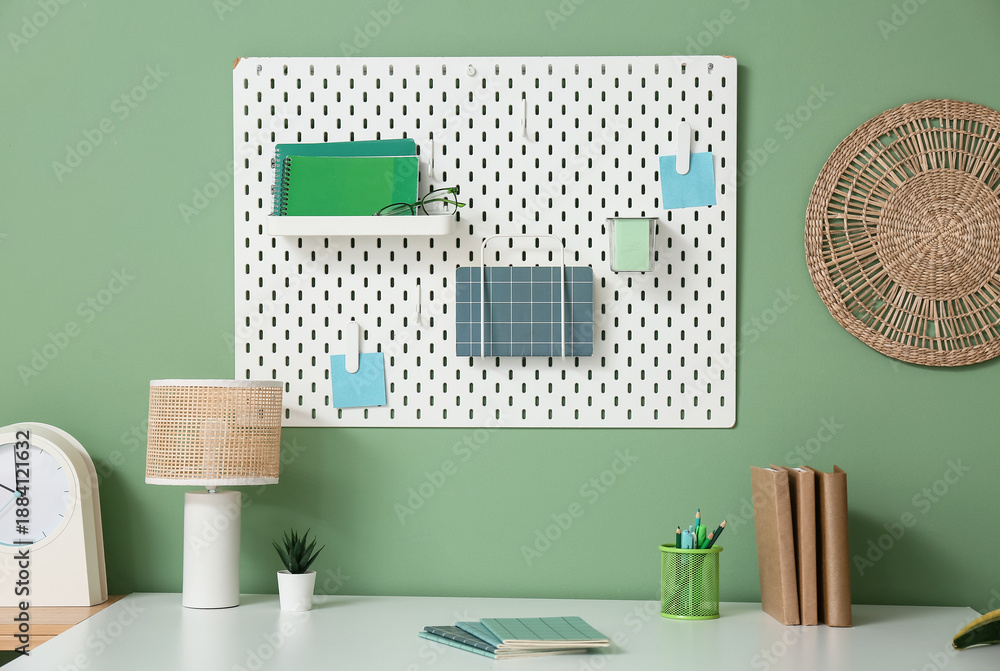 Comfortable workplace with stationery, lamp and pegboard on color wall
