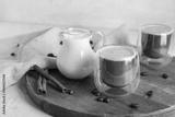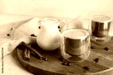 Glasses of hot coffee with cinnamon and jug of fresh milk on white background