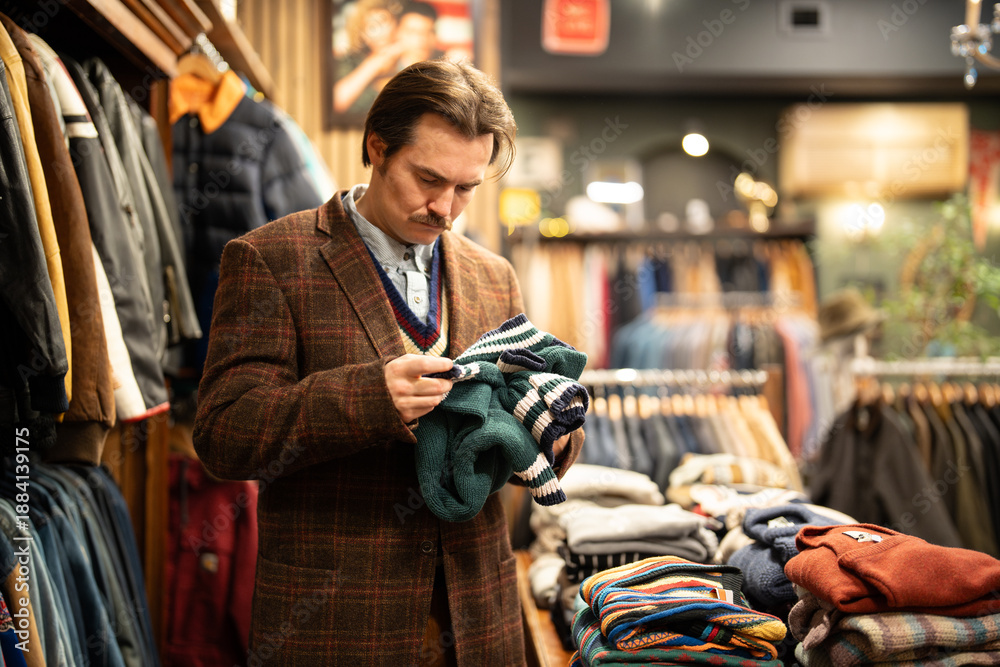 Mustachioed man in trendy wool blazer holding knitted jumper checking item condition and quality of yarn, chic male customer visiting second hand men's clothing boutique, vintage bargain hunting.