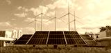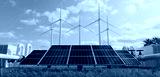 solar cell plant and wind generators in urban area connected to smart grid.Energy supply,eolic turbine,distribution of energy,Powerplant,energy transmission,eco energy,high voltage supply concept.