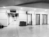 Traveler waiting with luggage in a modern Krakow airport hallway near restrooms and glass doors