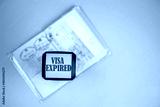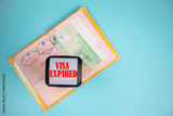 Passport with international visa stamps marked Visa Expired, airplane and approval stamper, representing overstayed visa and immigration issues.