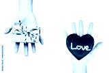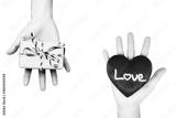 Halftone hands exchanging love heart and gift box. Valentine's Day romantic concept.