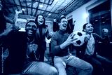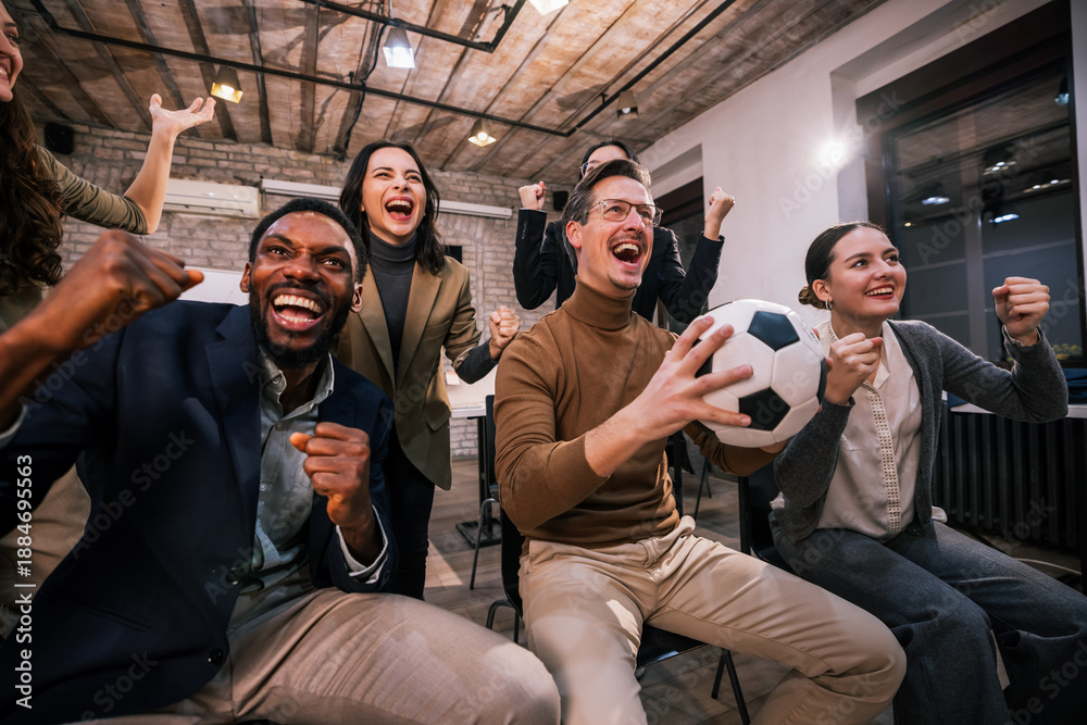 Happy office team watching a football game during a work break, cheering and celebrating together, with one person holding a football, symbolizing unity and work life balance.
