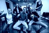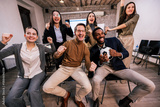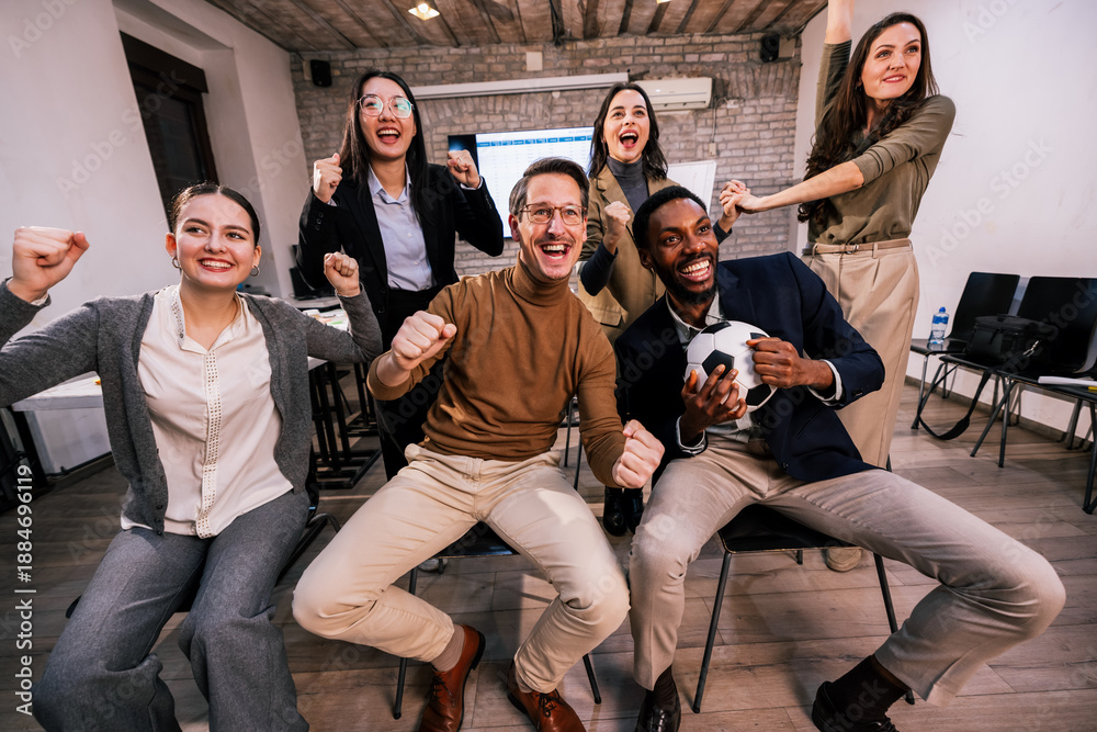 Group of coworkers watching a football match at the workplace, cheering together while one person holds a football, showing teamwork, excitement, and positive office culture.