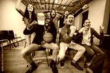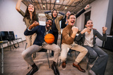 Group of coworkers watching a basketball game at the workplace, cheering together while one person holds a basketball, showing teamwork, fun, and work life balance.