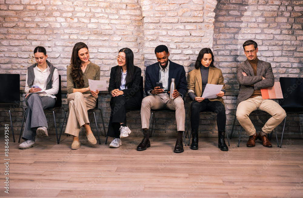 Job applicants waiting in a business office lobby before an interview, representing hiring, recruitment, patience, and professional career development.