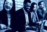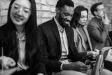 Diverse group of people sitting in an office waiting room before a job interview, showing career opportunity, recruitment process, and professional business environment.