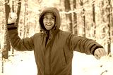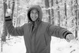 Happy Young man in orange jacket enjoying winter day, playing snowballs in snowy forest park, active outdoor leisure and fun, Playful moment in snow, weekend adventure, cold snowy day, winter walk