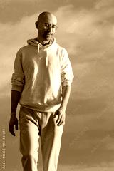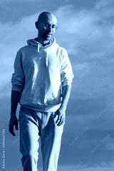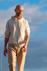 positive Energetic young man in white hoodie standing against vibrant blue sky, Modern traveler embodying youth, freedom, and positive aspiration, journey self-discovery, forward towards new horizons