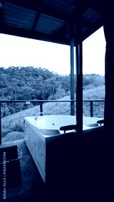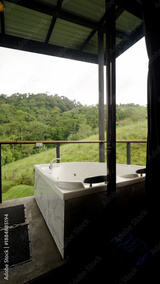 Relaxing private jacuzzi tub positioned on an outdoor balcony or terrace, offering panoramic views of the tropical jungle landscape