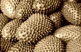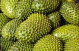 Fresh soursop displayed in a Colombian market square, showing its spiky green texture and natural appearance.
