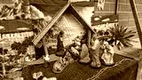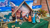 Traditional Colombian nativity scene with handcrafted figures, rural houses and biblical scenes, surrounded by plants and natural elements that evoke Christmas in Colombia.