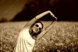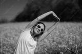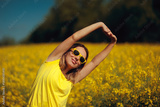 Woman with Sunglasses Stretches Her Arms in Rapeseed Field. Lady enjoys the sunlight while stretching her arms in a golden canola field