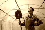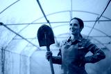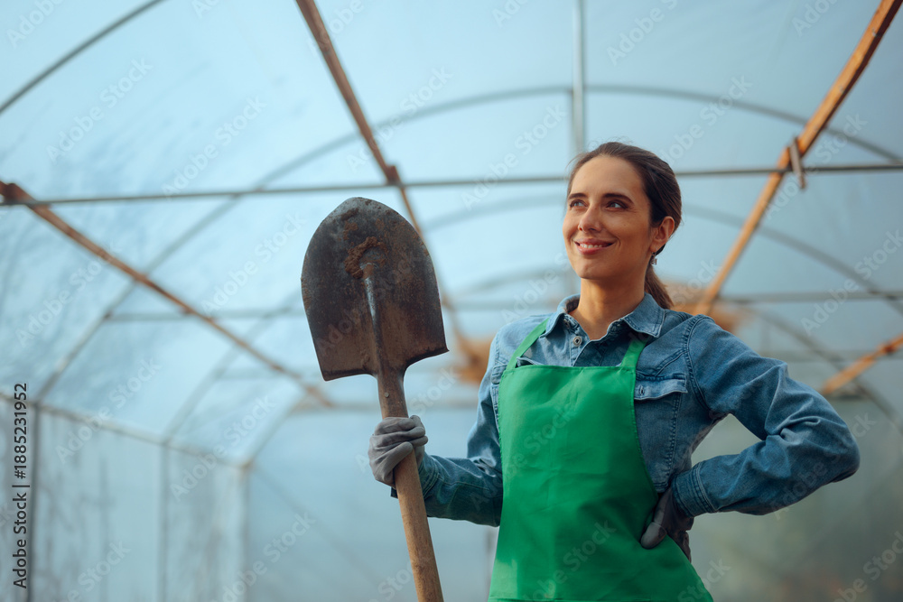 Greenhouse Worker Holding a Spade Ready to Plant. Person who begins spring agricultural work in their own hothouse