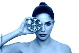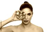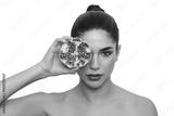 Woman holding pomegranate fruit on white background, showcasing vibrant seeds and skin