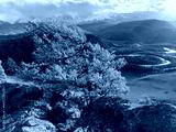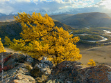 Golden autumn tree on rocky slope overlooking winding river through valley with evergreen forest and distant snow capped mountains under bright blue sky.