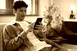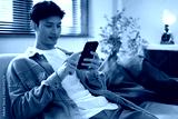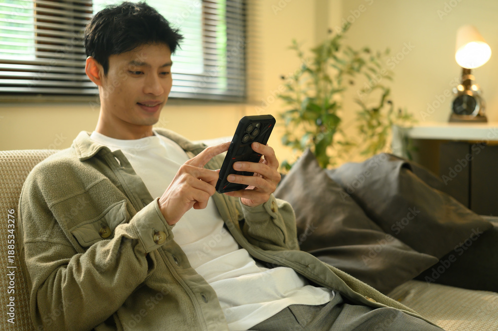 Casual lifestyle scene of a close-up shot of a young man using a mobile phone while relaxing in his modern home