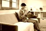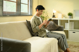 Happy man enjoying his free time at home, checking messages on his phone in a comfortable setting