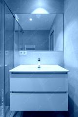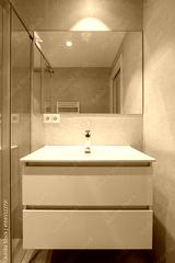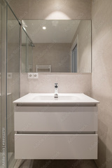 Modern bathroom interior with a sleek white vanity, mirror, and glass shower. Neutral tones create a clean and minimalist atmosphere.
