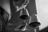 Caucasian middle aged man pouring red wine into glass, holding stemware with one hand while using towel to steady bottle, close up of hands and wine glasses in indoor setting