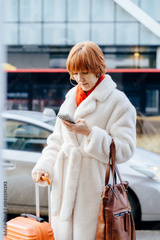 Mature woman using smartphone while standing with suitcase on city street