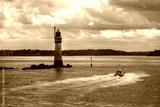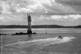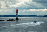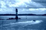 Boat passing the Grand Jardin lighthouse, dark clouds in Saint Malo, Ille-et-Vilaine, Brittany, France