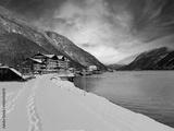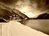 snow covered mountain lake achensee in austria with pertisau winter landscape with sunset clouds