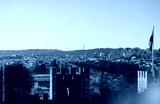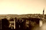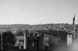 Golden sunlight bathes the skyline of Lisbon, revealing its beauty from the ancient castle's walls. The vibrant city bustles below, filled with life and charm as the day draws to a close