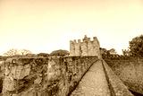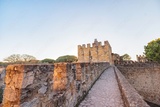 Wandering along stone pathways, a traveler admires the majestic castle towers of Portugal at dusk, surrounded by lush trees and a serene sky