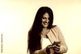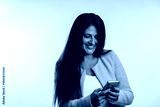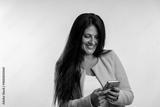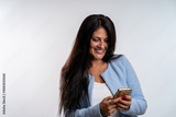 Smiling brunette businesswoman girl posing isolated on grey wall background studio portait. Mock up copy space. Using mobile phone, typing sms message.