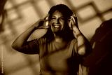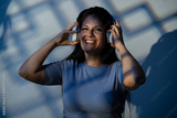 Portrait of joyful woman with wireless headphones, hard gobo light, blue moon shadows