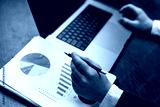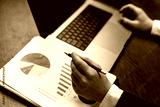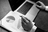 Business professional analyzing financial reports with pie chart and bar graph on paper, laptop computer positioned on wooden desk in office setting