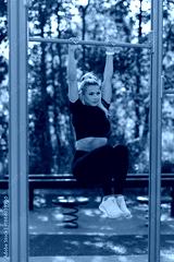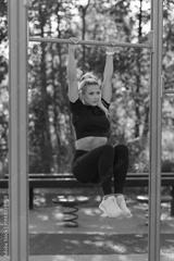 Woman practicing outdoor strength training on fitness equipment in park setting