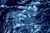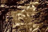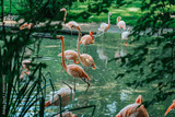 Flock of flamingos standing in shallow water.Flamingos Standing in Pond at the Zoo.Large group of flamingos standing and feeding in shallow water of a pond.