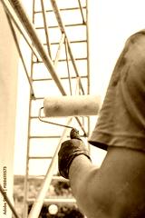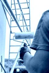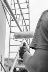 building renovation concept. paint roller held by a worker during exterior building renovation.