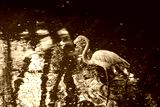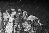 Single flamingo standing in water with reflection. Calm wildlife scene with natural light, tranquil mood and balanced composition.