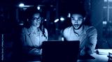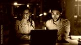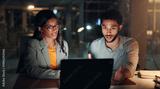 Laptop, conversation and business people in office at night with creative project in collaboration. Feedback, tech and manager with magazine editors for advice, publishing deadline and article