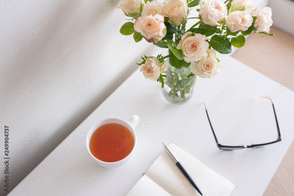 Beautiful older woman with short grey hair and striking blue eyes with hands partially covering face against neutral background (selective focus)
