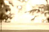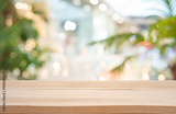 Wooden table on deeply blurred tropical restaurant background as mockup for product display
