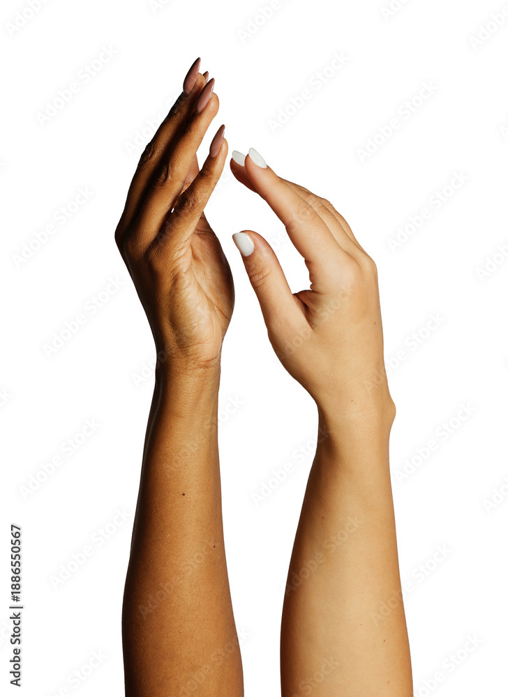 Close up of beautifully soft hands, diversity multiracial group and beauty and manicure concept, Concept of unity and togetherness, helping hand and support