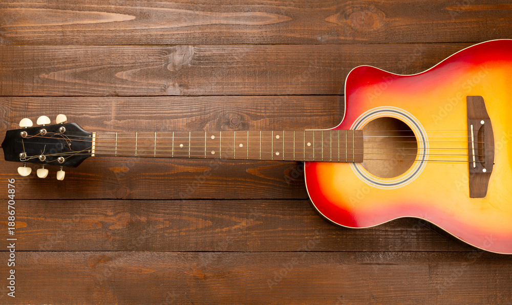 Bright acoustic guitar on wooden background, top view