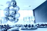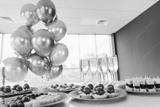 Office gathering with chic appetizers, champagne glasses, and festive balloon decorations celebrating a collaborative teamwork event
