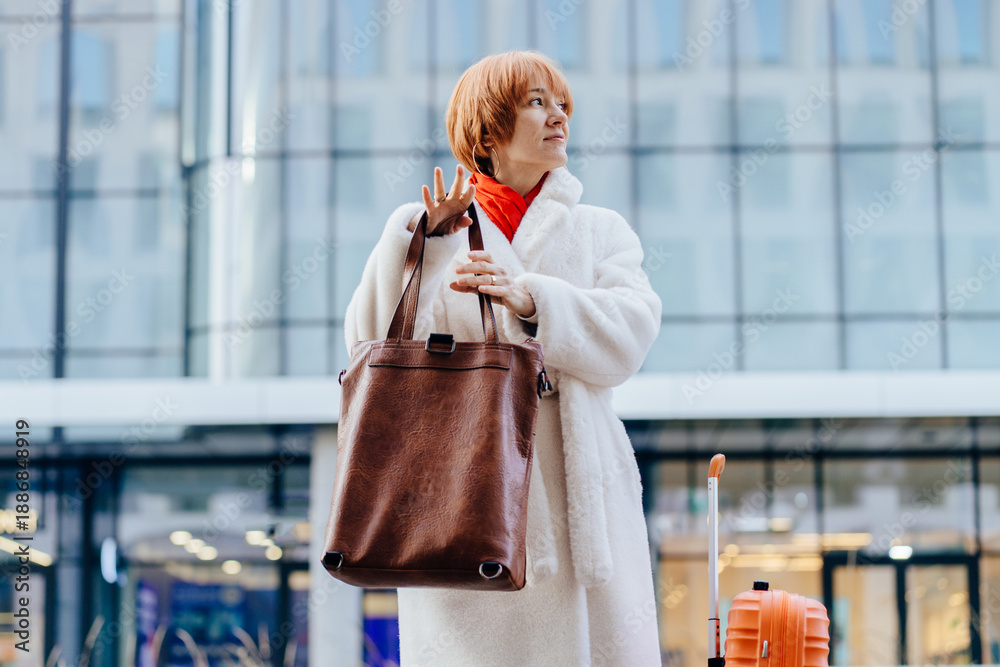 Confident woman lifting bag during city travel