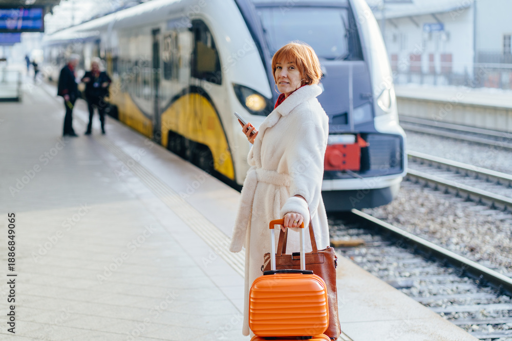 Business trip, work travel, train, professional, winter city transport, solo female passenger.
